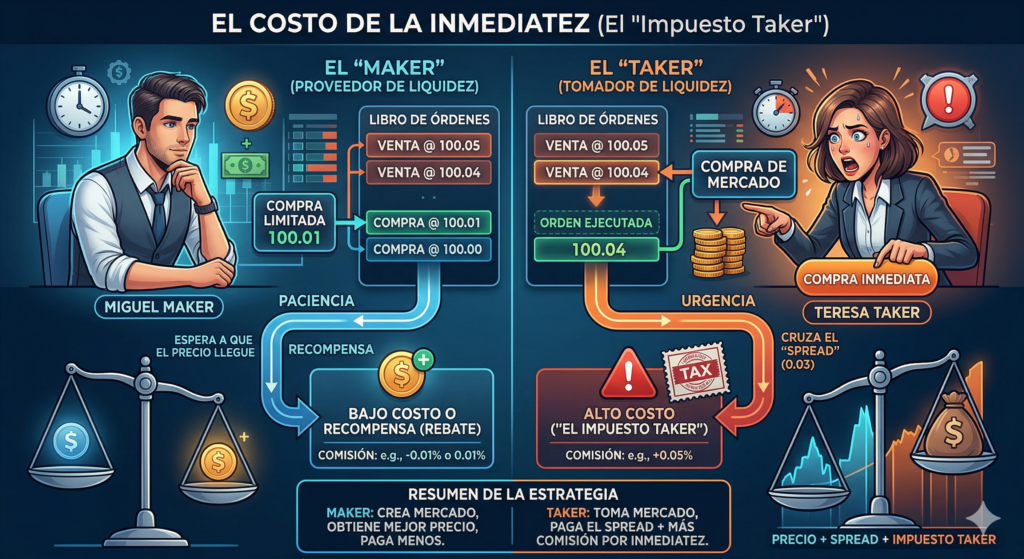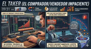 Ese comerciante es el MAKER. Él hace (Make) el mercado al publicar las ofertas. Provee liquidez. Su ventaja es que dicta el precio y se queda con la ganancia bruta (compró a 50 y vendió a 80). Su desventaja es que asume el «Costo del Tiempo»; tiene que ser paciente y esperar a que los Takers lleguen a él.
