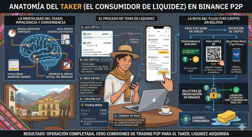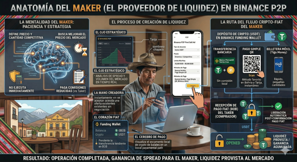 Imagina que estás operando desde Tarija. Pones un anuncio de Maker para Vender USDT. Quien hará clic en tu anuncio (el Taker) podría ser el dueño de una empresa de tecnología en Santa Cruz que necesita pagar una licencia de software en Estados Unidos hoy mismo.