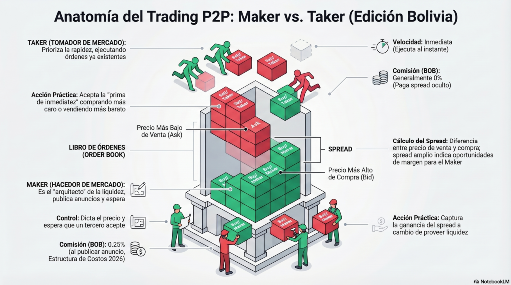 En el arbitraje de USDT/BOB, tu objetivo principal para ser rentable es convertirte en el comerciante del mercado (Maker).